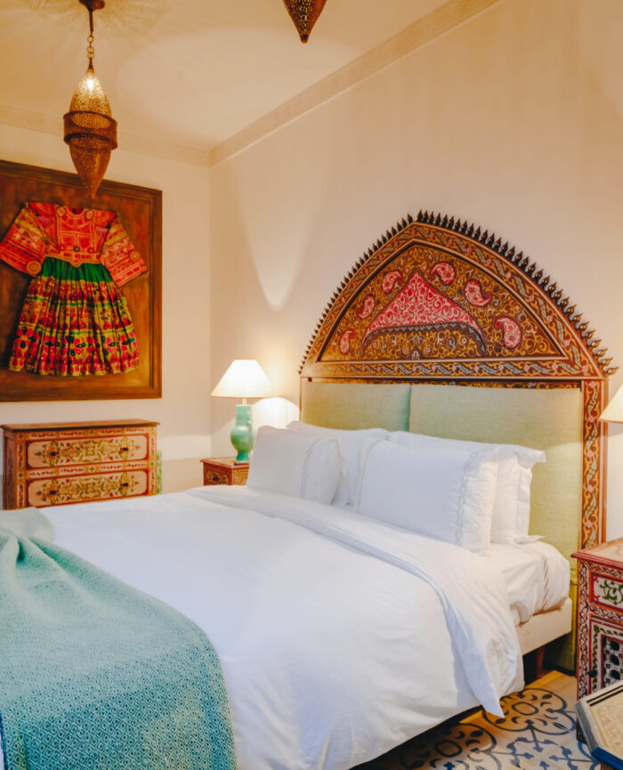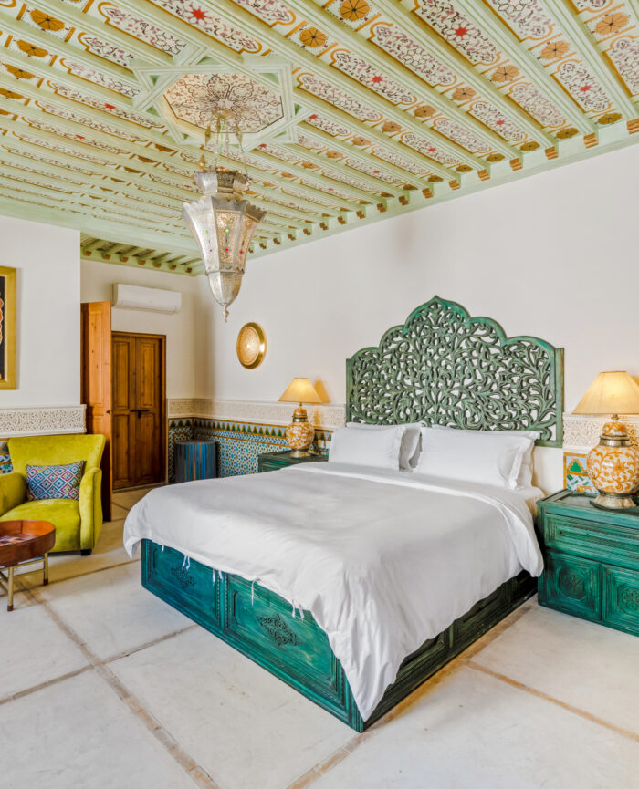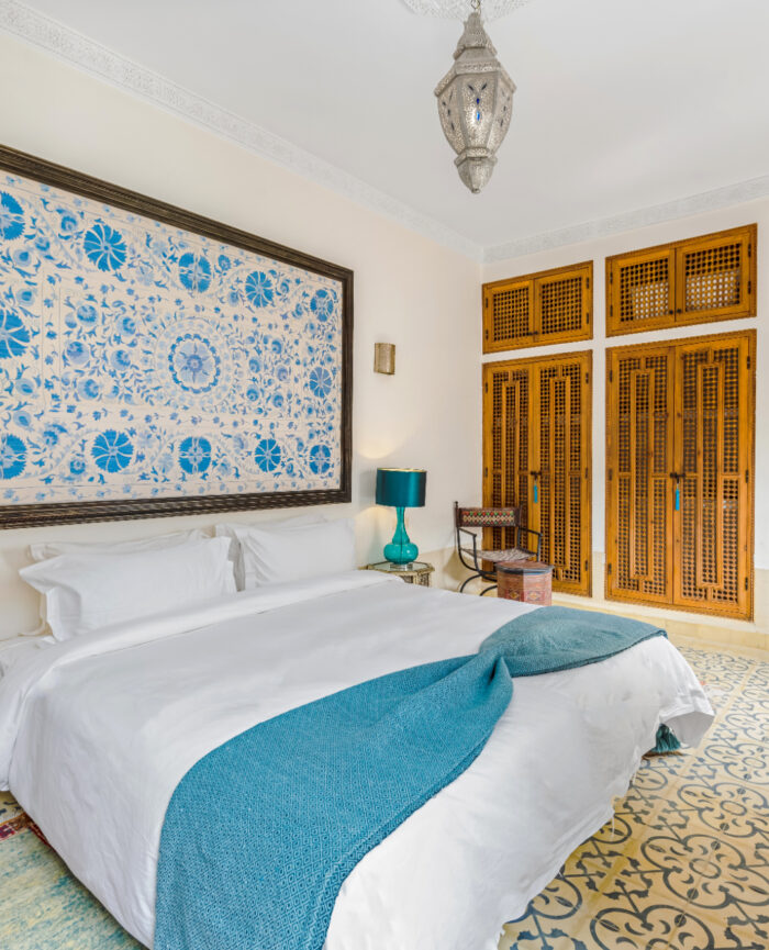 Every meticulous detail has been carefully designed for your pleasure including our crisp Egyptian cotton sheets and duvets, high end furnishings enriched with artworks, textiles, Moroccan hanging lamps and master craftsmen created woodwork, traditional zellige tiles and hand carved arches and ceilings reminiscent of Royal Palaces of times of yore. Enjoy the burl wood and fine furnishings and our mother of pearl game table for a riveting game of chess or any other of your liking. With ease, take in every detail as you sink into the refined spaces of Riad Mon Amour.